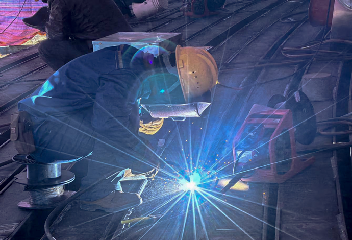 現(xiàn)場工人進行金屬板材接縫處理。