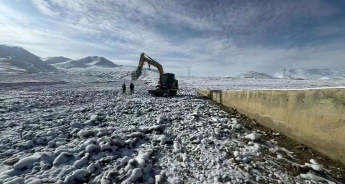 現(xiàn)場工作人員在冰雪覆蓋的灌區(qū)進(jìn)行清淤工作。