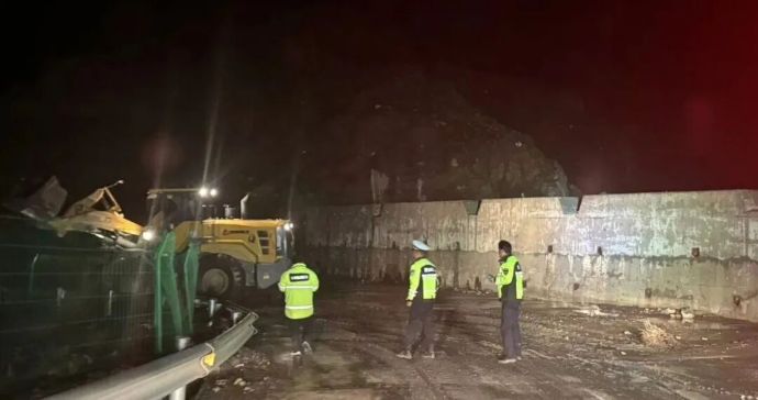 現(xiàn)場工作人員深夜進(jìn)行主汛期庫周公路清通作業(yè)。